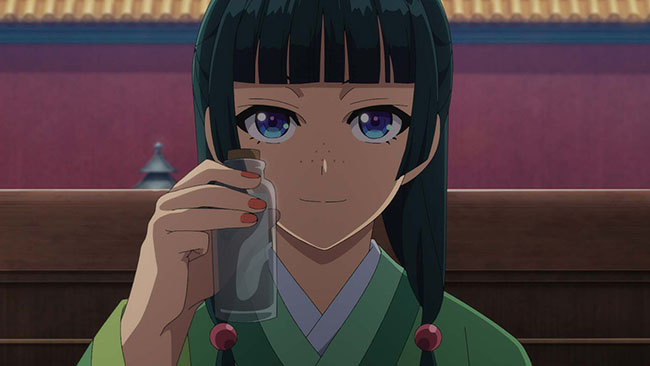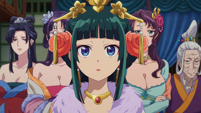 後宮で玉葉妃(ギョクヨウヒ)と梨花妃(リファヒ)の赤子たちが体調不良に陥っているとの噂を聞いた猫猫は、化粧品に含まれる有害物質が原因だと特定する。玉葉妃の子を救ったことで、美貌の持ち主の宦官・壬氏(ジンシ)の目に留まり、猫猫は玉葉妃の専属侍女兼毒見係へと抜擢される。